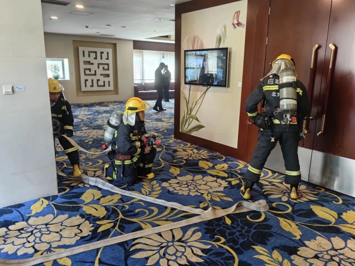 华腾美居酒店顺利通过此次检查考核。检查结束后,为提高酒店应急救援实战水平,劲松消防特勤站就地开展了一次火灾救援现场演练,参演人员由特勤站救援人员和酒店微型消防站义务救援人员组成。演练取得圆满成功。