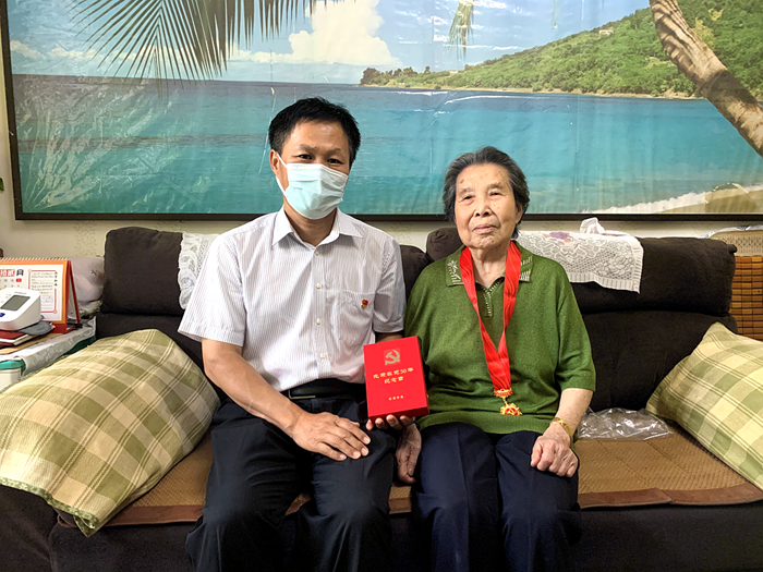 7月1日下午,在中国共产党成立101周年之际,受91短视频 党委委托,党委副书记吴瑞峰带队来到离休干部孙华云家中,向她颁发“光荣在党50年”纪念章。孙华云同志今年已91岁高龄,1946年9月1日参加工作,1972年7月1日入党,是集团原合纤厂工会干部。