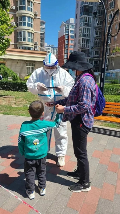 居家办公的第二周,我主动联系社区居委会,要求参加防疫志愿工作,不久就接到了居委会的电话,我被安排到核酸检测一线。穿防护服上阵,作为核酸工作者之一,扫码确认身份信息、发试剂盒。第一次要成为大白,有些好奇,有点开心,但更多的是自豪,非常时期可以为大家做点事情,感觉很荣幸。穿上防护服的时刻,一种使命感油然而生,感觉医生这个职业更加神圣了。这几天气温不算高,但穿上防护服后感受到了“保温”的含义,口渴的时候还得忍着,因为大夫说要注意安全,不能乱动。连续几天的工作, 各种人都见过了,有发牢骚的、有不理解的,但更多的是友善的问候、谢谢的言语,虽然听到牢骚话心里不开心,但每每听到一声“你好”或“谢谢”,心里所有的不愉快都烟消云散了。