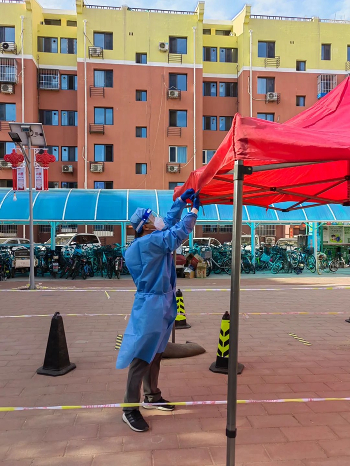 每天早上天刚亮,我就和居委会的工作人员一起来到小区的广场集合,穿戴好防护用具,搭建好临时遮阳棚、拉好警戒线、摆放好检测试管和棉签……为核酸安全采样做好前期准备工作。