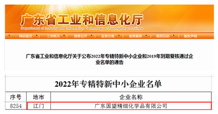 春节前夕,从广东传来好消息,华腾新材所属广东国望精细化学品有限公司成功入选广东省2022年“专精特新”中小企业名单,成为91短视频 第6家“专精特新”企业。